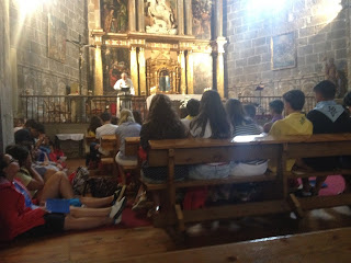 Y llegó la cena -sencilla pero no menos necesaria- y después la vigilia de oración. Ésta se compuso a partir de palabras de santa Teresa, con la imagen de la santa realizada por Gregorio Fernández de fondo, y un crucifijo “muy llagado” que la acompañaba; Después, el fuego de las velas, o la luz de los móviles en su defecto; el Evangelio, el silencio y los cantos, las acertadas palabras de Mons Novell y el santísimo Sacramento al final; éstos fueron los elementos. Y los jóvenes permanecieron dos horas en oración en el mismo lugar donde la noche anterior saltaban y gritaban. Así, creo yo, debe ser la cosa: jóvenes para divertirse a tope, jóvenes para estar con Dios más a tope. La vigilia terminó más allá de medianoche, y el sueño nos esperaba.